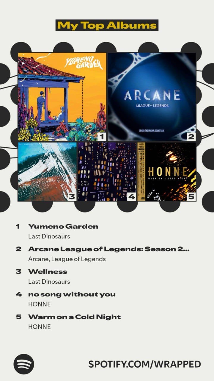 I noticed something surprising from my own Spotify Wrapped. The "Top Songs" were very different from my "Top Albums". Would have thought that these 2 lists would have significant overlap (at least it did significantly overlap in the past).